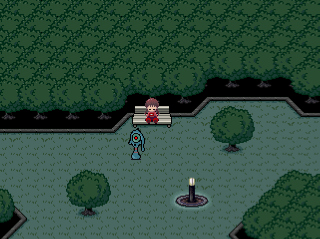 Al extremo este del parque hay un precipicio en cuyo borde permanecen tres personas verdes mirando, tal vez, la ciudad que se puede observar a lo lejos o las luciérnagas/mariposas del cielo. Estas sólo se mueven al llevar el cuchillo. Justo al borde del precipicio se encuentra un cobertizo de ladrillo. Al entrar en él se accede a una especie de túnel oscuro en donde se encuentran una serie de flores plateadas que emiten un plácido sonido al tocarlas. Si se hacen sonar un número impar de veces, la salida del túnel enviará a Madotsuki al Mundo Fantasma.