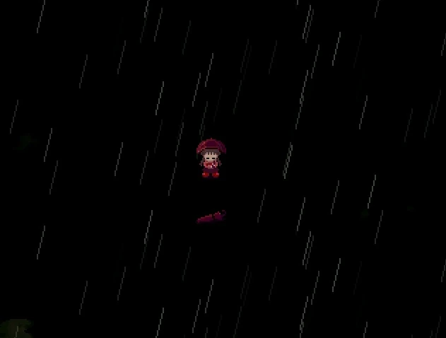 Involuntario: Madotsuki sujeta un paraguas rojo y llueve.