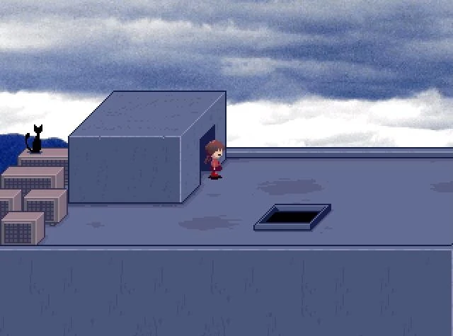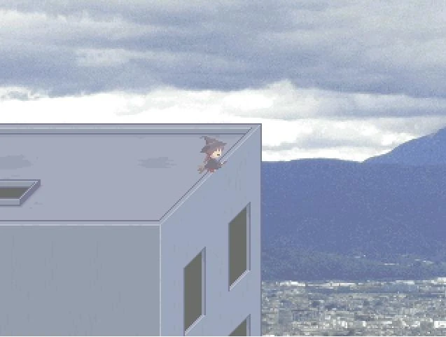 Una vez ahí activa el efecto Bruja y presiona la tecla 1, luego camina hacia la derecha hasta que Madotsuki pase el borde de la azotea.