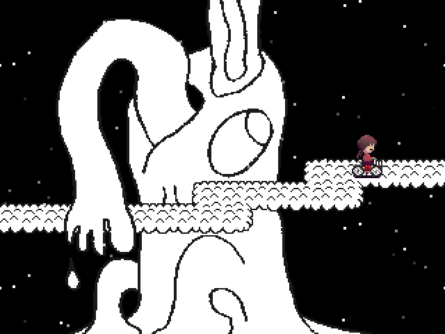 In the game, there is a path next to it that makes odd noises when stepped on. If Madotsuki travels to the right, then she will find herself with the Thing with the Quivering Jaw. There is a spot on the path where the screen will scroll up if the player holds the up button, showing its full appearance. As it is a decorative NPC, it doesn't react to any of the effects.