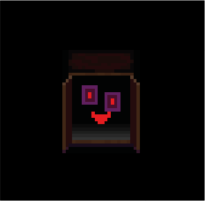 Its appearance is that of a simple face with uneven, square-shaped eyes and a smiling red mouth. The eyes consist of two purple squares surrounding small red pupils.