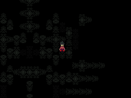 As the world is very dark, it is nearly impossible to see characters or objects without using the Lamp effect. The Knife effect can be found here. It is picked up off the ground between the two floor patterns that look like hands near the center of the map. There are 3 Pissipissini that roam this world; they are barely visible in the darkness and barely react to the player. A ghost named Follony is also found here, but unlike the other two ghosts (Nopperabou Ghost and Fleebie), it does not give any effects, but will follow Madotsuki erratically if it sees her.