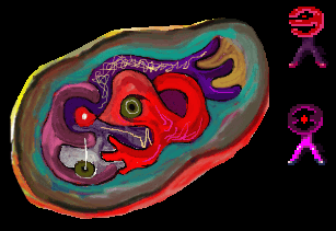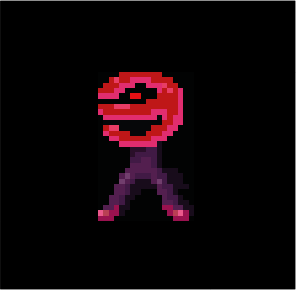 E-Man's head resembles a maroon mirrored letter "e" with a single red eye, and he has purple legs with maroon shoes. He is visually similar to O-Man in the Flute Room one room over.