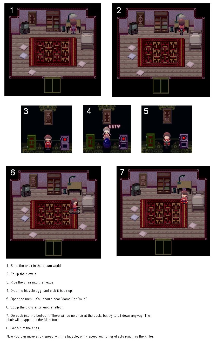 A useful glitch that quadruples Madotsuki's walking speed. Although Madotsuki will appear as her normal sprite (except in the FC Worlds), the glitch will be active. The bicycle is the most commonly used effect for this, as it allows for quadruple speed. The Speed Glitch is an oversight caused by allowing the player to use the menu in the chair.