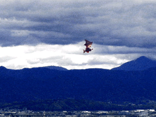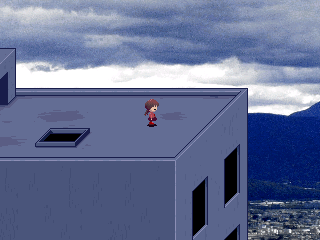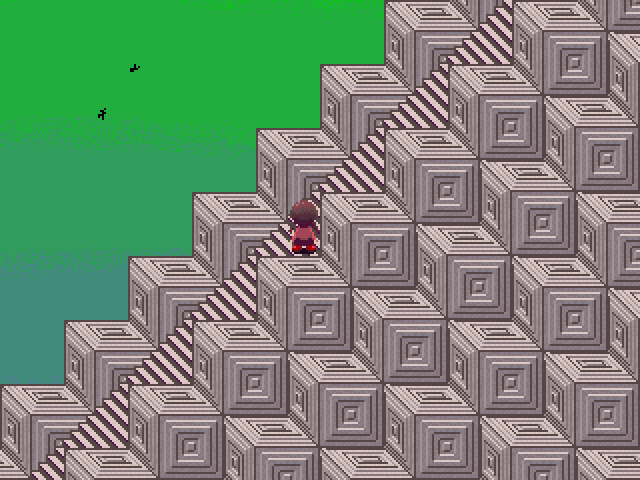 Description: Using the Witch effect and flying to the right side of the building will yield a flash. After the flash, you are able to control Madotsuki flying through the clouds, in the style of a 2D arcade game. Pressing the interact button lets the player return back to the rooftop. Pressing 1 causes the broom to disappear mid-flight, causing the screen to black out. The dream then ends prematurely with Madotsuki lying on the floor. There is also a black cat on top of the roof, which has 1/64 chance to appear on a place where Madotsuki can interact with while on the rooftop, which can be triggered by accessing the rooftop, either from the stairway or by returning to it from the event.