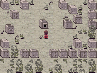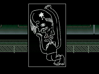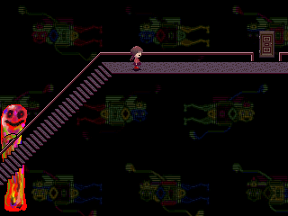 Description: When interacted with, the wall tile produces a text box with a 'typing' sound like the Lizardmen, but no text is shown. Doing this repeatedly gradually causes the room to corrupt, until the game eventually 'crashes' with a nasty stuttering sound. This causes Madotsuki to wake up.