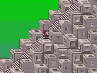 Description: The player is transported to a sectioned-off area of Block World, with its music at half the speed (it shares Eyeball World's theme in version 0.04). The background is the same one that sometimes appears outside of Madotsuki's dream balcony, and there is a bed at the end of the path. After you sleep in it, a Toriningen spawns at the start of the path and chases the player. She cannot catch the player when they are sleeping in the bed. If she catches you, she will send you to an isolated area in the Footprint Path B, next to the pinkish Goppa. You will be unable to move, as there is no path to walk on.