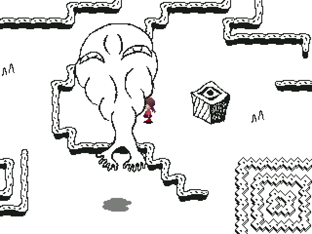 By walking up to Uboa, Madotsuki will be transported in a looped world with a bleeding creature in the background and the music from the White Desert playing. The only way to get out of this room is to pinch yourself awake or use the Medamaude effect. When Poniko is killed while the event is triggered, Uboa will not appear (without Poniko's sprite), only Madotsuki trapped in the shaking reformed house.