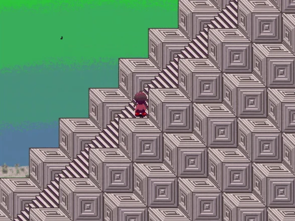 The Falling Men are simply drawn stick-figures that spiral around in the sky (like the UFOs and Severed Heads), although they never reach the ground themselves. When the player walks across two tiles along the stairs, a 1/4 chance is triggered for each one, although the second one can only show up if the first one did, making the second one very rare to encounter, being a 1/16 chance.