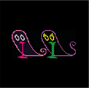 Frog Characters (かえるキャラ, Kaeru Kyara) are decorative NPCs that are drooling, ghost-like creatures whose essence 'sticks' to Madotsuki when she interacts with them in Forest World. While they are named frog characters in their files, they do not actually resemble frogs, and look more like namekuji. There are two types of them: the first type has a pink outline, with white eyelids and maroon liquid coming out of their mouths, and the second type has a purple outline, yellow eyelashes while vomiting green liquid. There are 12 frog characters in total, with 6 of each type.