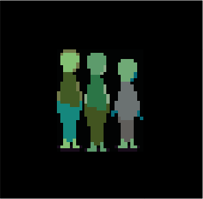 Their appearance is that of faceless humanoids, all of them featuring green in their design. Initially they have turned their backs towards Madotsuki, but after using the Cat effect or having equipped the Knife, they will also be shown from the side as they move around.