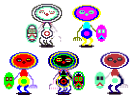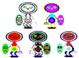 The Shield-Folk are colorful, though immobile, characters that reside in Shield-Folk World. They are spread out greatly among this area, with some on their own, and some in large groups. They come in many different varieties, each with their own unique colors, and some are taller than others.