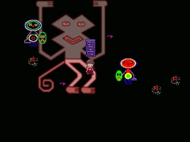 The Cat effect is received here by interacting with Nekoin, who can be found near a group of red-faced Shield Folk northwest of the entrance when the world is first entered. It will spin and move around the world randomly, making it a bit difficult to locate. Near the center of the map, surrounded by a few animated tiles, there is a black gate that leads the player to the Static Maze that serves as the route to the FC House. Other than that, the world itself consists of many lone Shield-Folk and more arrangements of tiles.