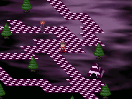 The Checkered Tile Path (チェック, Check) is an area that connects Candle World to Hell. Trees (identical to the ones in Snow World) and lamp posts cluster around the path. It has three routes that lead to a conjoined one with a Nenrikido that takes the player to Hell, but is guarded by a lunatic Toriningen running around. The whole perspective of the location is diagonal, similarly to the Mall.