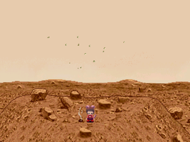 After crash-landing on Mars, there is a hill that Madotsuki can go up. Upon standing on the hill's summit, there appears to be nothing except a hole that can be entered with the Midget effect to see Mars-san. However, after using the Cat effect at the top of the hill, there is a 1 in 4 chance that a UFO will appear. The UFOs appear to spin and fly to the scene at different speeds, which is much more noticeable when multiple UFOs can be observed there.